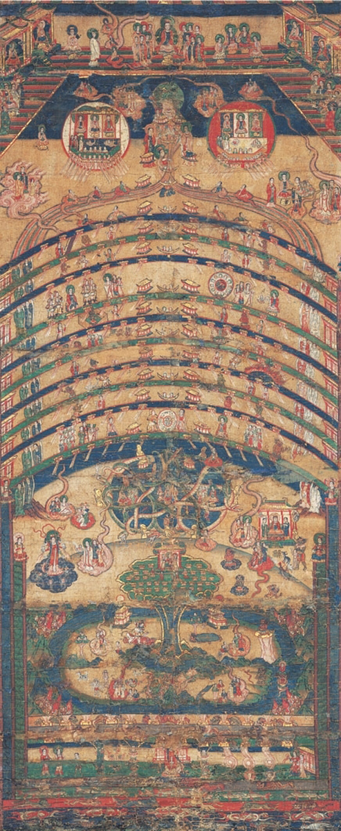 The Manichaean Diagram of the Universe (Japanese: マニ教宇宙図) is currently housed in Japan. The map measures 137.1 cm in length and 56.6 cm in width. It is a colored religious painting created by a Fujian-Zhejiang painting workshop during the Yuan and Ming dynasties. The artwork depicts the Manichaean cosmic landscape of “ten heavens and eight earths”. As the only extant visual representation that fully illustrates the Manichaean cosmogony, it bears witness to the grand scale of the Manichaean world as described in Mani’s own “Book of Pictures” (Ārzhang). Based on the classification by Yoshida Yutaka and Zsuzsanna Gaulácsi, the entire painting can be divided into seven main layers, with numerous further subdivisions of pictorial combinations between scenes. A total of 589 figures are depicted, showcasing highly complex pictorial patterns and an extremely rich interplay of knowledge and iconography.